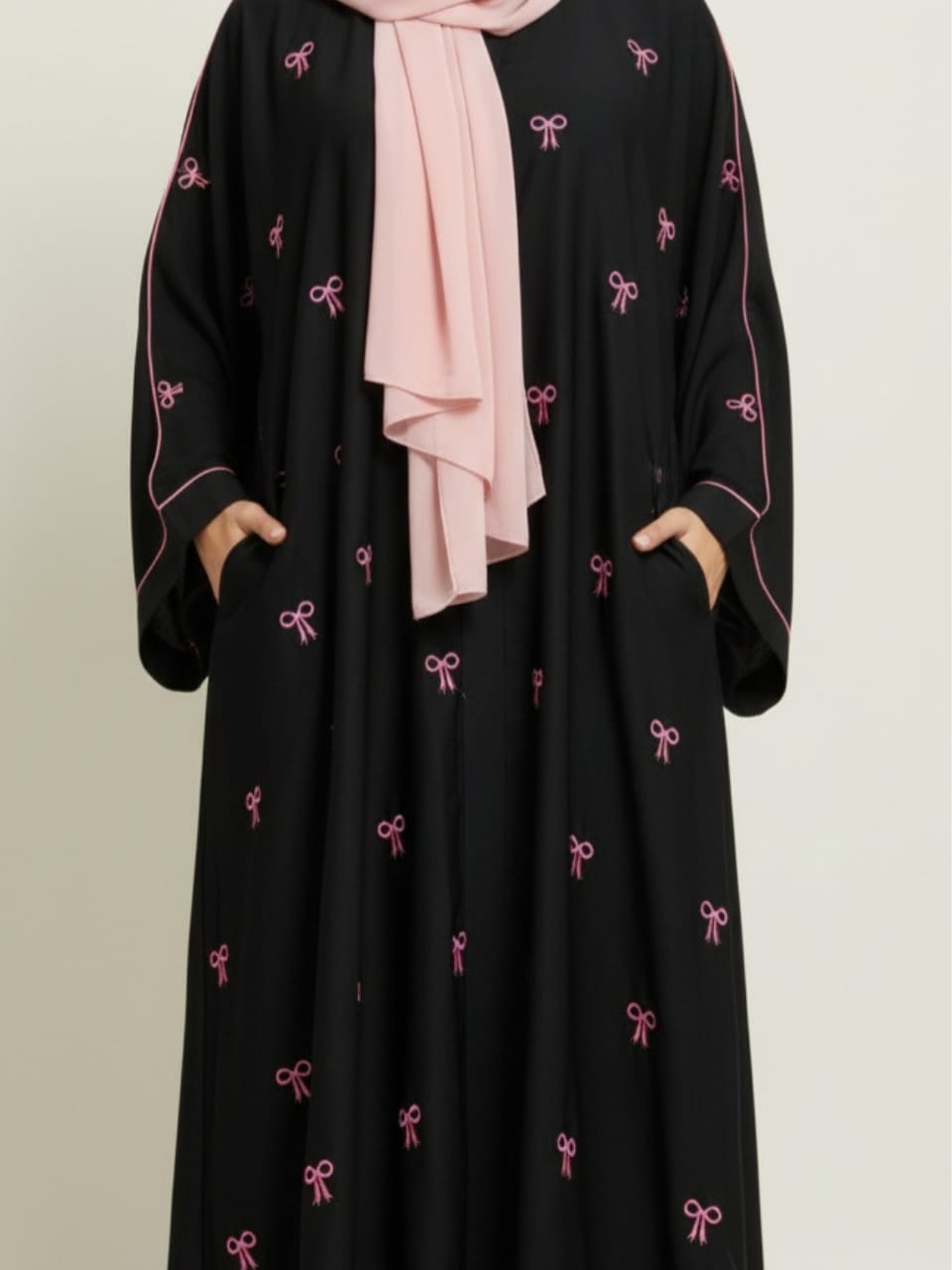 Elegant black abaya with delicate pink bow embroidery, crafted in premium