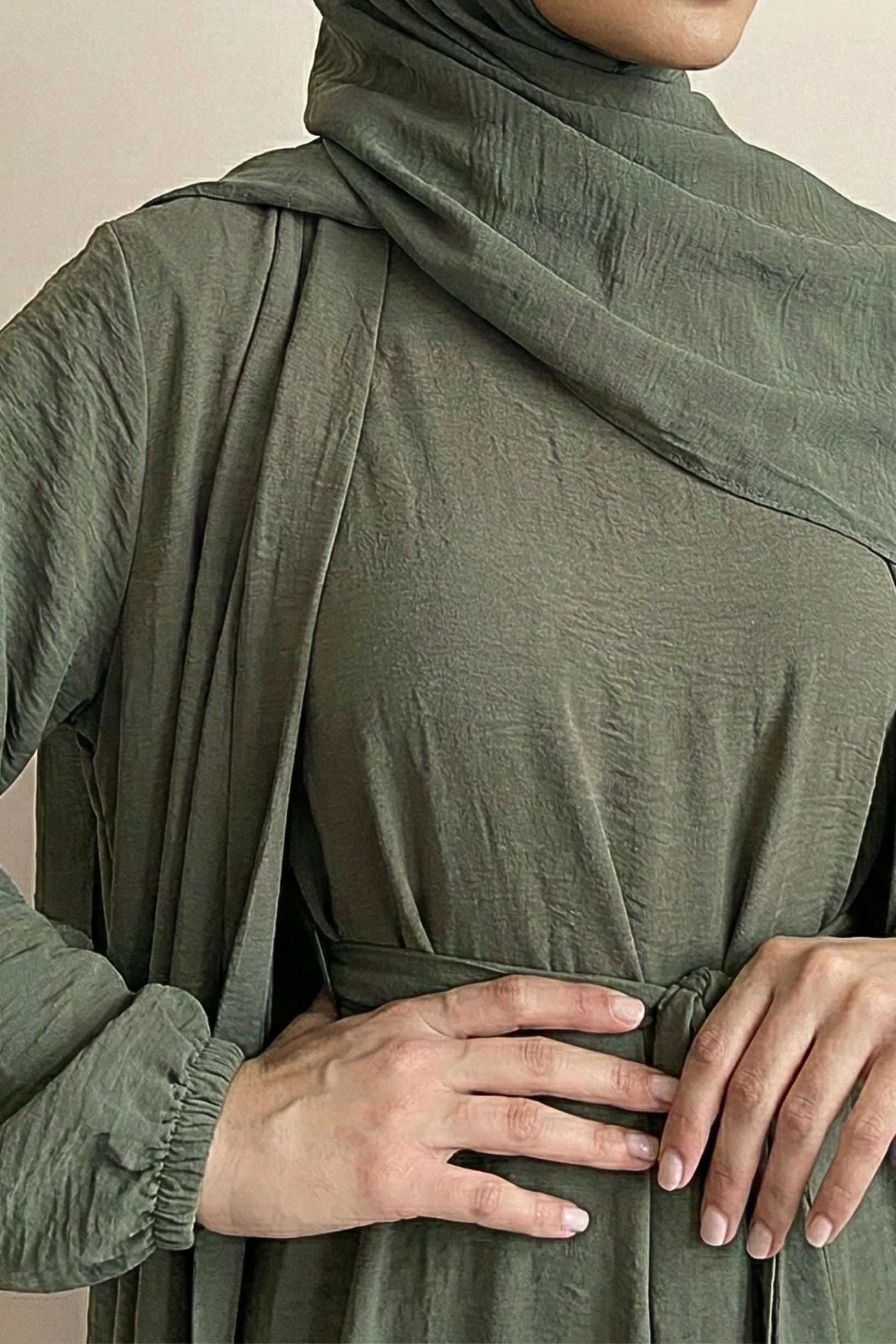 This olive green modest maxi dress offers a graceful flow with a comfortable and elegant fit.Designed with full sleeves and a waist belt, it is perfect for everyday wear, gatherings, and modest fashion styling.